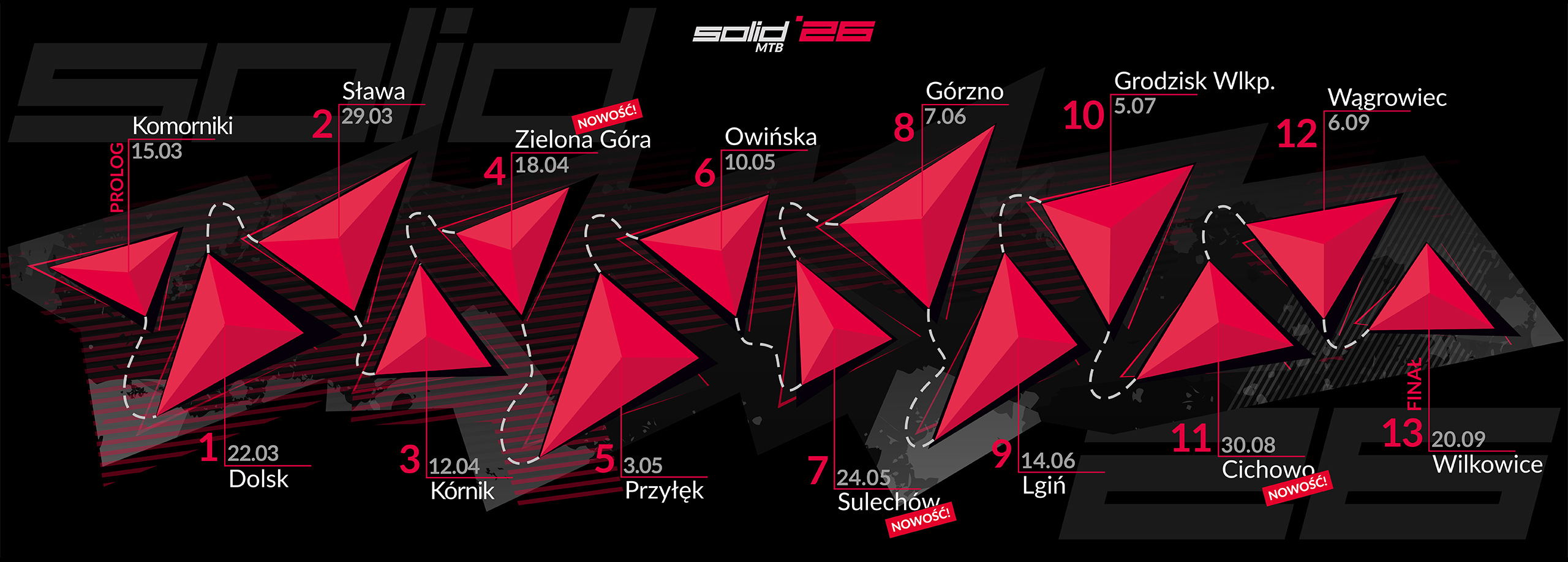 Terminarz SolidMTB ’25 wraz z miejscowościami 23.03 KOMORNIKI – prolog 30.03 – DOLSK...